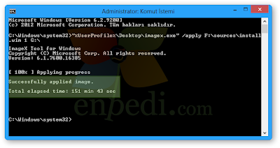 II- Windows To Go sürücünüze 64 Bit Windows 8 kuracaksanız ilk komutu, 32 Bit Windows 8 kuracaksanız 2. komutu girin ve Enter'a basın.