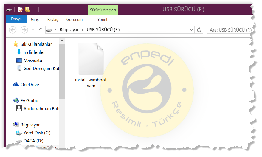 U harfinin yerine install_wimboot.wim dosyanızı kaydettiğiniz USB sürücünün (Harici disk veya flash sürücü) harfini yazın.